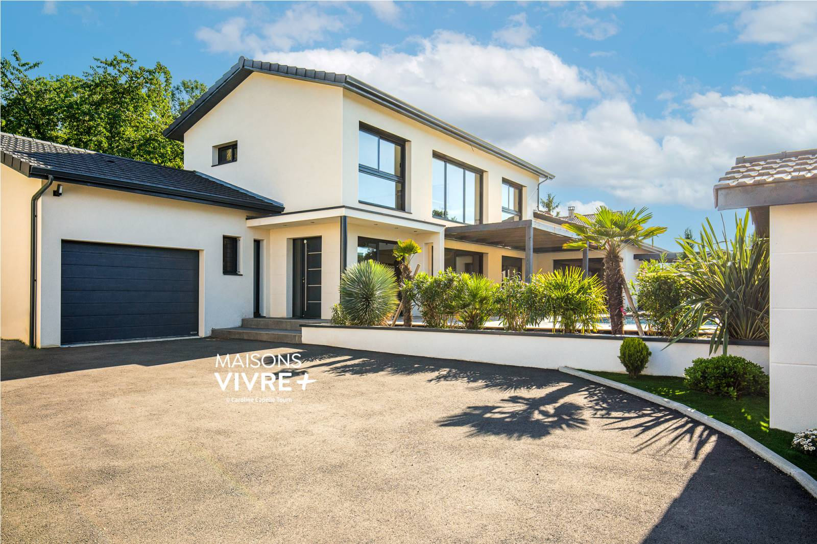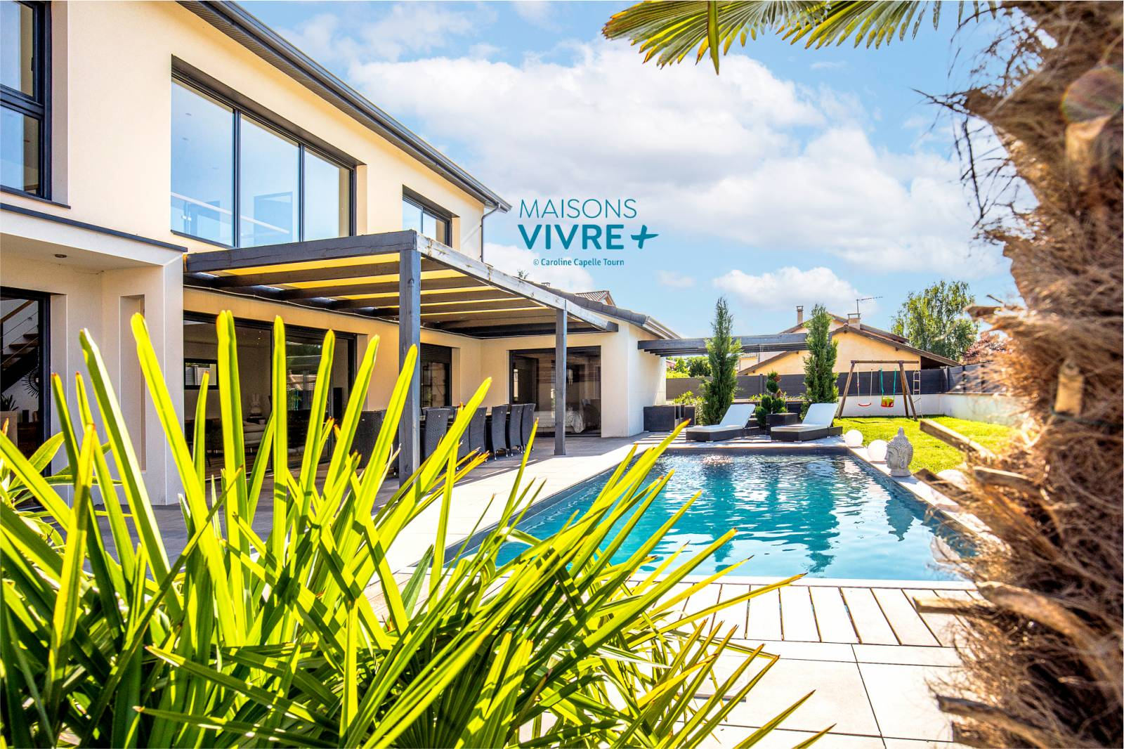 Nous avons construit cette belle maison contemporaine dans un petit lotissement à la limite de l’Ain et du Rhône, près de Genay. En collaboration avec nos clients, notre équipe a conçu une maison d’aspect contemporaine utilisant les codes de l’architecture actuelle : grandes ouvertures, menuiseries gris anthracite et pergola bioclimatique. A l’intérieur, un grand vide sur séjour plonge la pièce de vie dans un bain de lumière naturelle. Nos clients ont aménagé cette belle maison et son extérieur avec goût en choisissant des prestations haut de gamme : carrelage grande lame imitation parquet, escalier métal bois, garde-corps vitrés, cuisine ouverte avec îlot central.