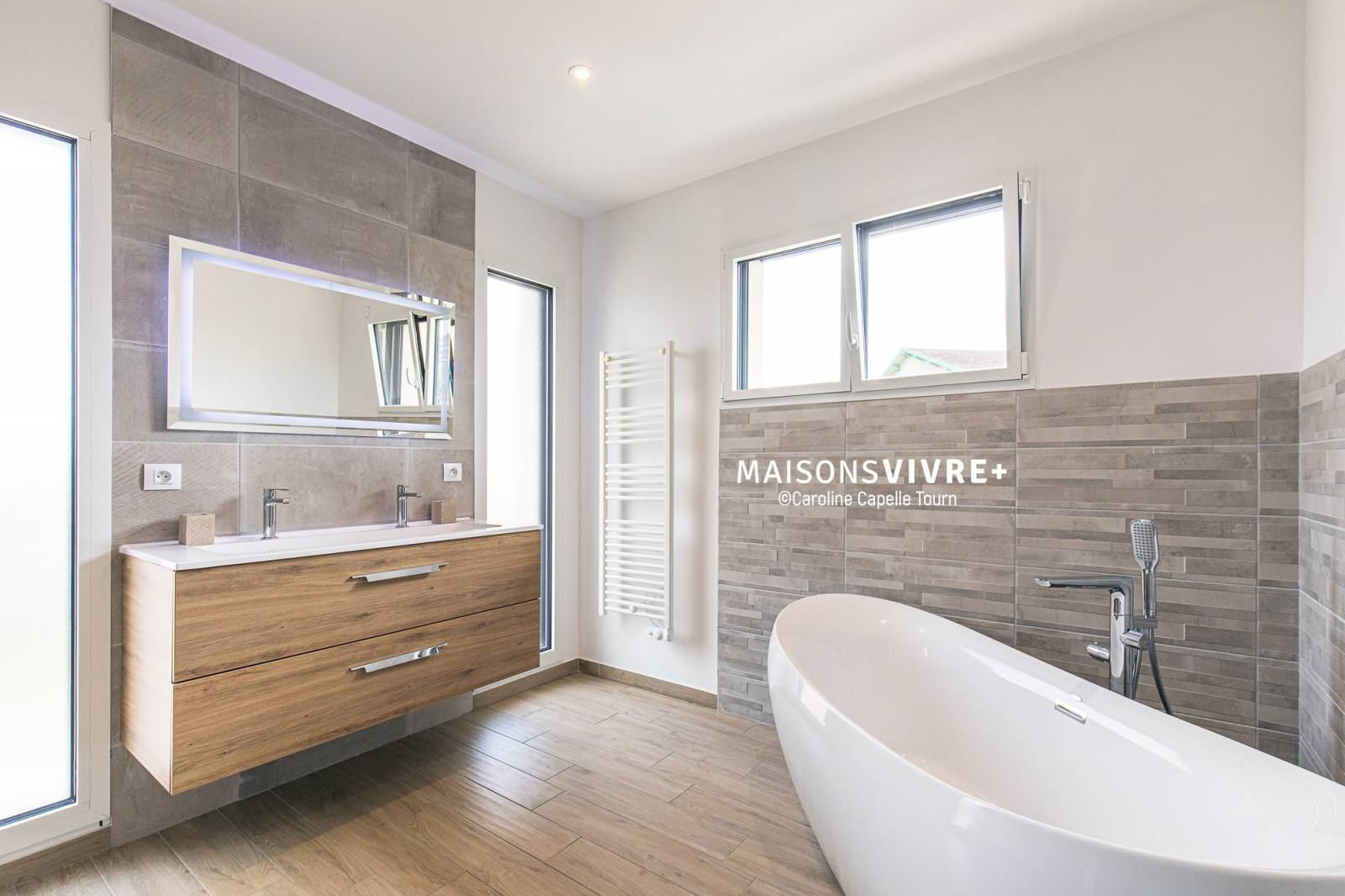 Nous avons pensé la maison avec un garage en sous-sol, une grande pièce de vie lumineuse au rez-de-chaussée ainsi qu’une suite parentale avec douche italienne et baignoire îlot.