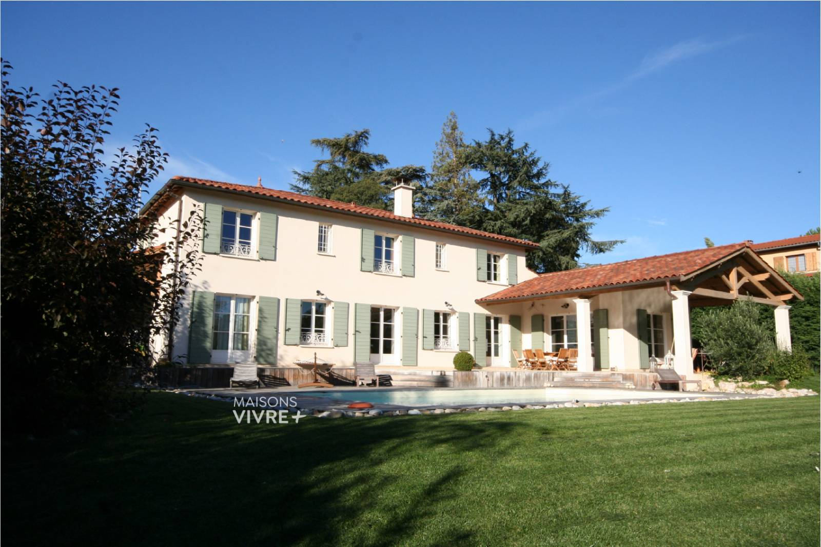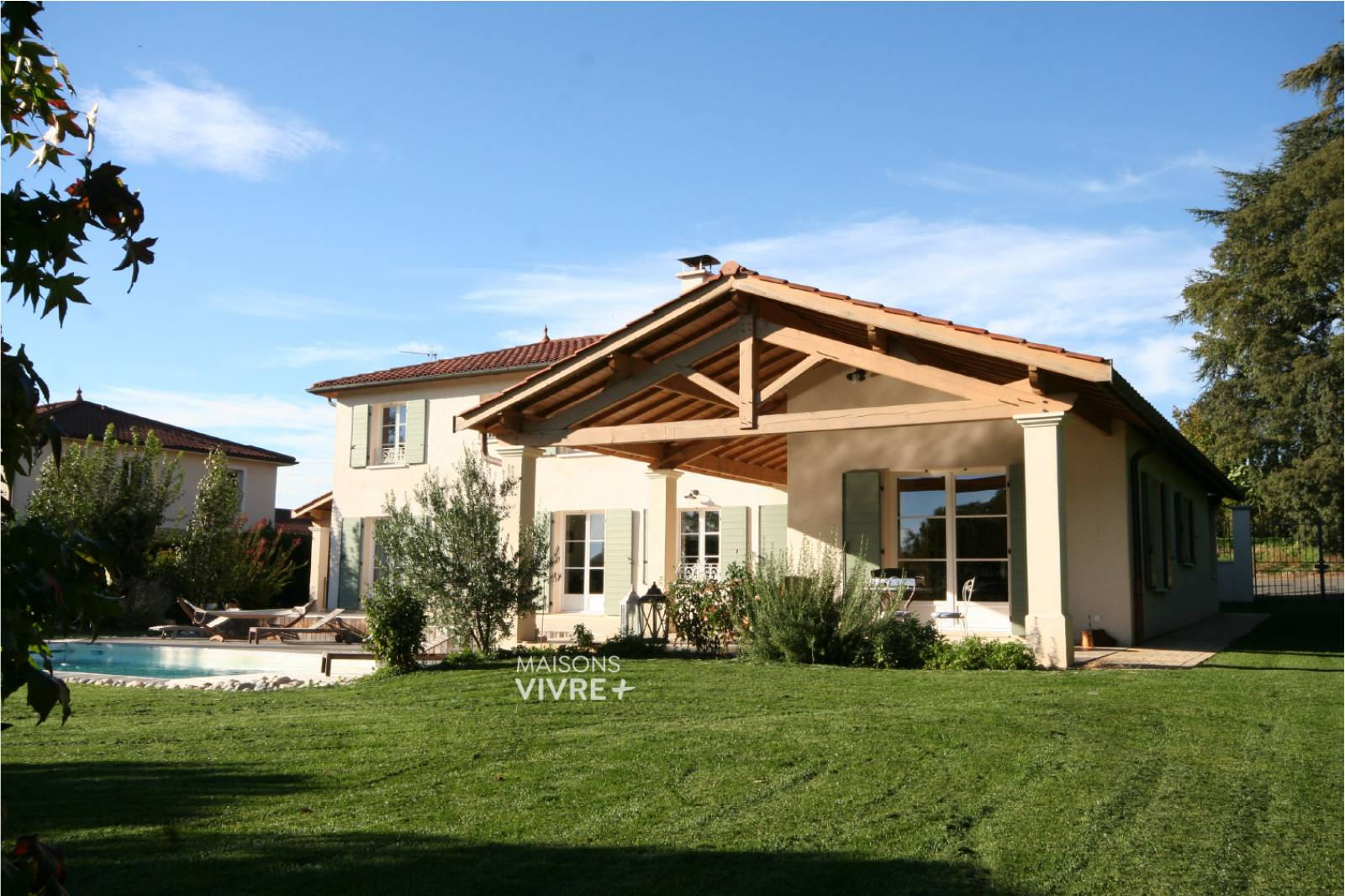 Cette maison dispose d’un vaste espace de vie baigné de luminosité. Elle est composée d’une grande cuisine avec salle à manger bénéficiant des trois orientations est, sud et ouest, avec un accès direct à la terrasse couverte.
