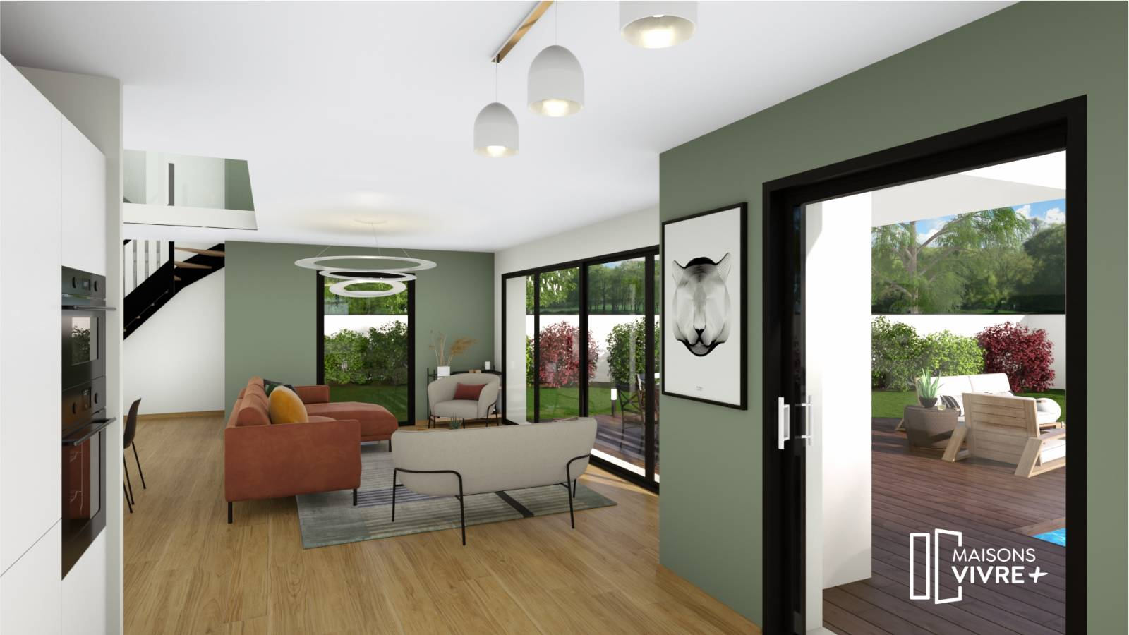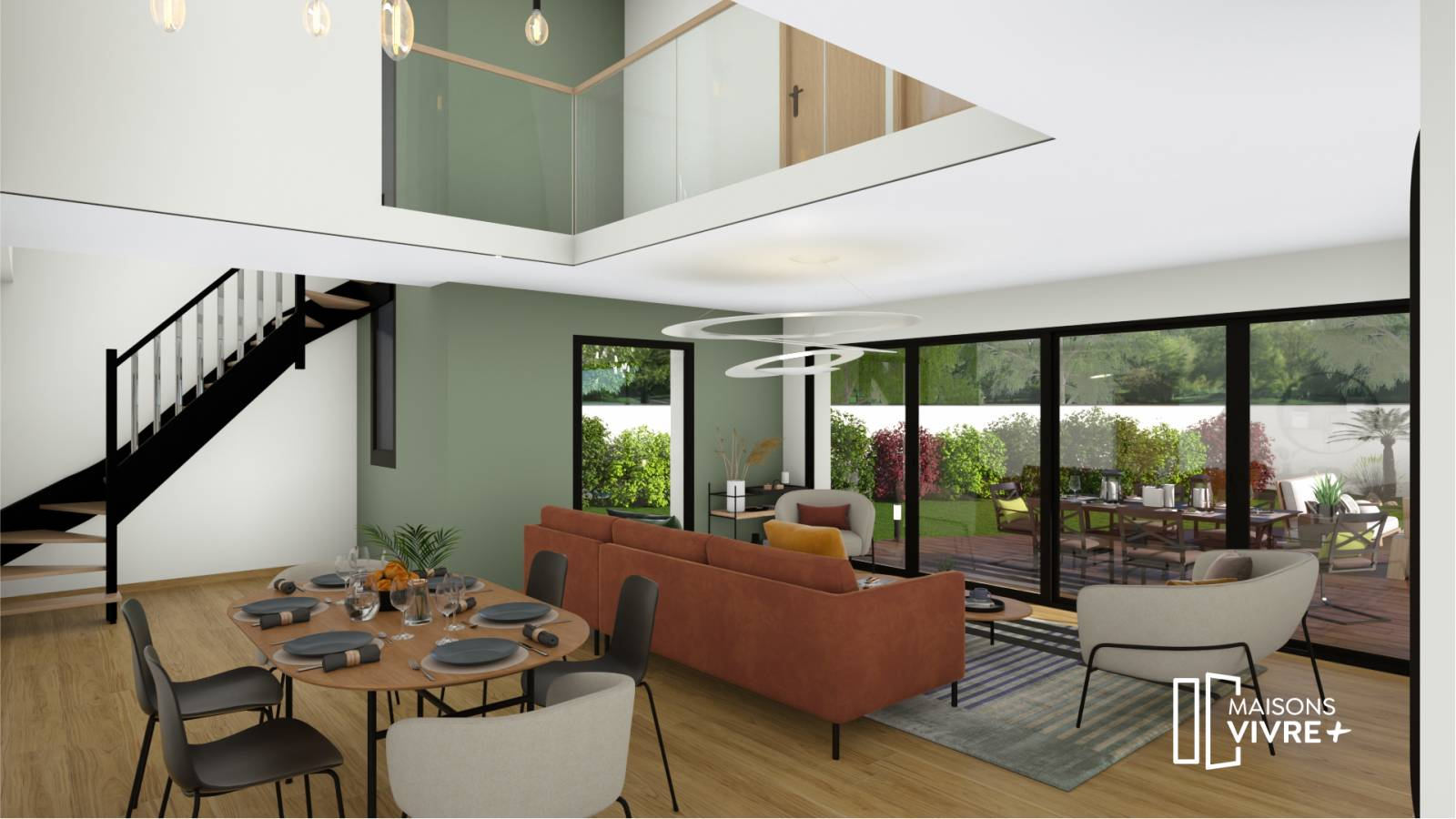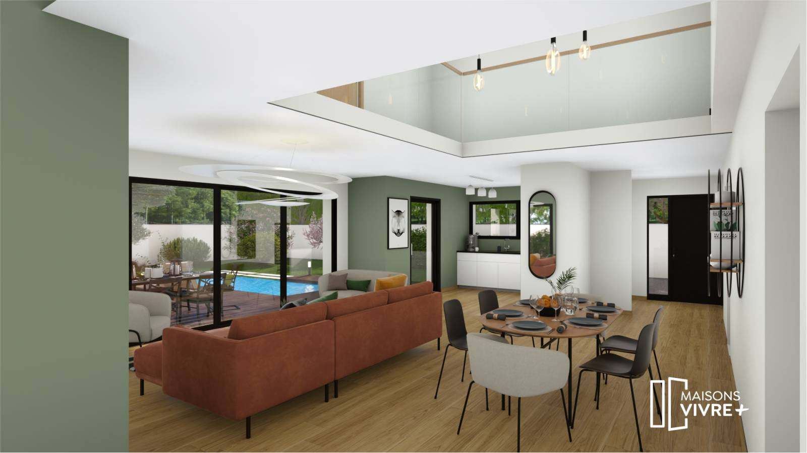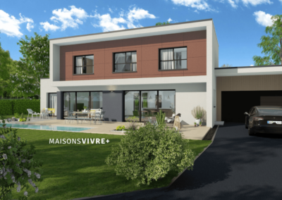Maisons Vivre Plus vous propose un projet moderne avec une toiture végétalisée, d’une superficie de 147 m², comprenant un garage de 23 m². Vous profiterez d’une grande pièce de vie avec une cuisine ouverte de 57 m², d’une suite parentale avec salle de bain et dressing, d’un grand cellier de 6 m², des toilettes séparées, ainsi que de 2 chambres de 12 m², d’un bureau de 12 m², d’une grande salle de bain équipée, de toilettes séparées et d’une mezzanine offrant une hauteur sous plafond de 5,85 m au-dessus de la salle à manger.
