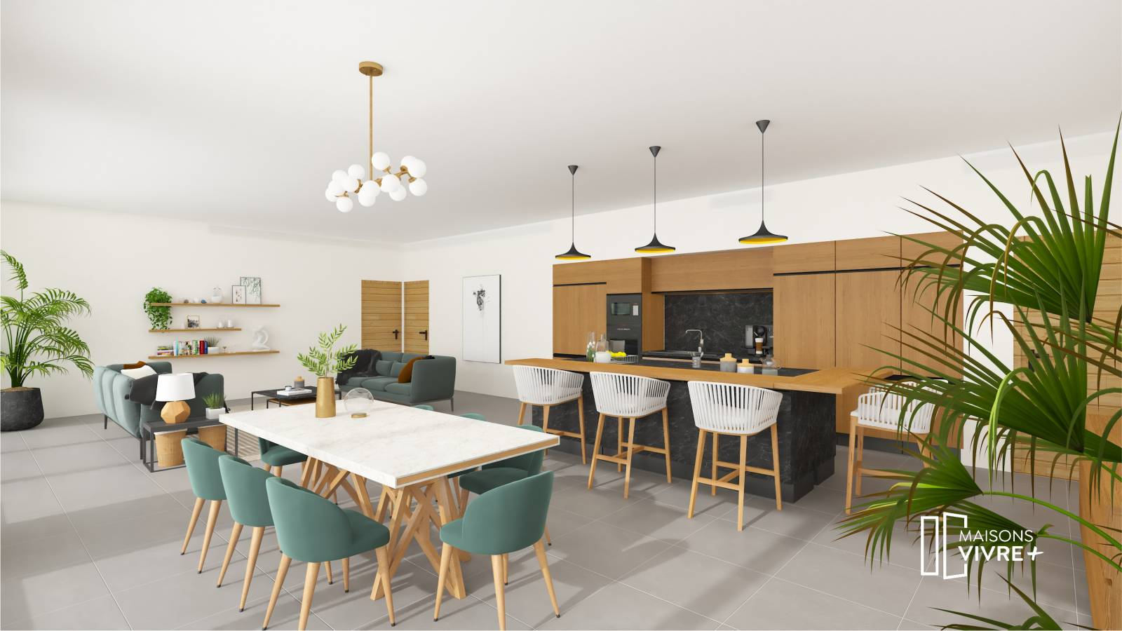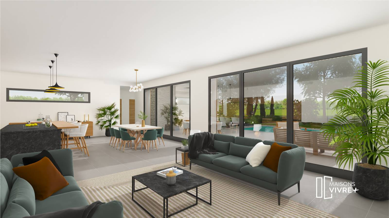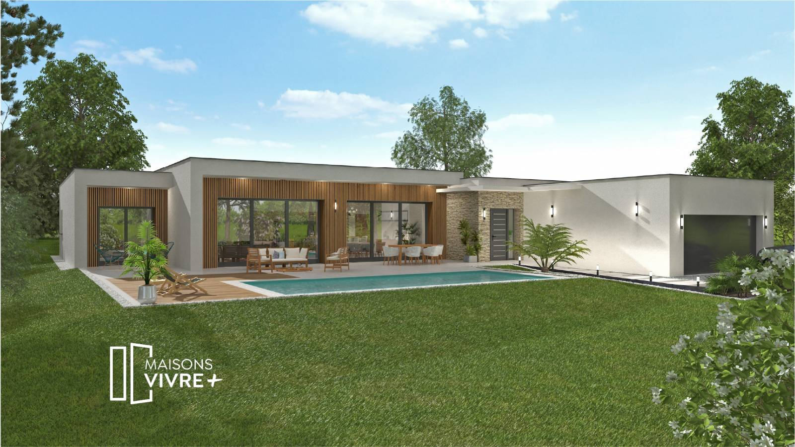 Maisons Vivre PLUS vous propose de construire votre maison selon vos envies et sur mesure. Nous vous proposons grâce à notre partenaire foncier, sur un terrain de 1390 m², un projet haut de gamme en plain-pied de 179 m² habitable avec un garage de 48m². Entrez dans ce beau plain-pied par un hall d’accueil de 10 m² communiquant avec la buanderie et le garage. Le hall s’ouvre sur un séjour cuisine ouverte de 72 m² avec une hauteur sous plafond de 2,90 m. Un espace suite parental à l’écart des chambres d’enfants composé d’une chambre de 13m² avec un grand dressing, une grande salle de douche et des toilettes séparés. Les chambres d’enfants font 14.5m² chacune et partagent une grande salle de bain avec toilettes séparés. Un troisième WC séparé se trouve à l’entrée de la maison.